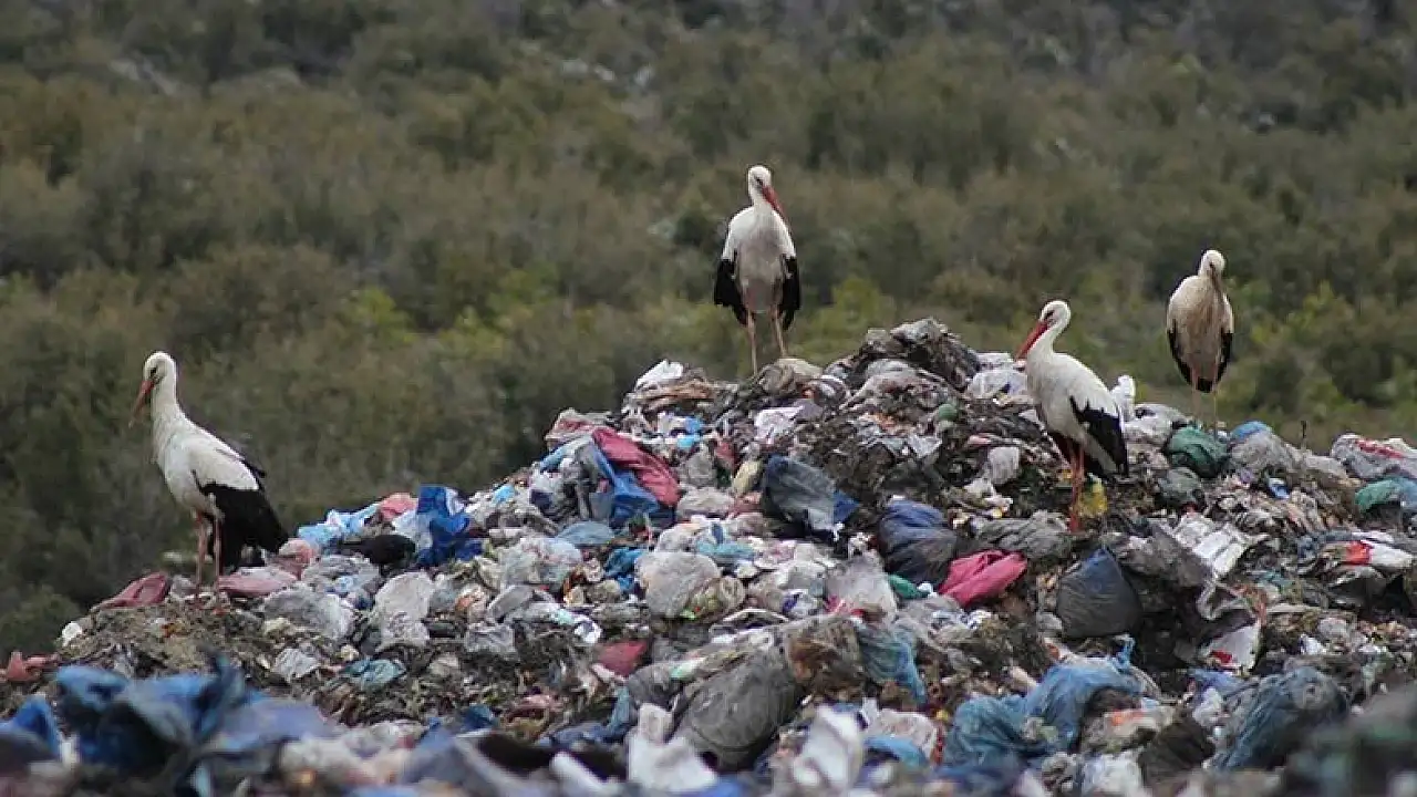 Alana dökülen çöplerin arasında yiyecek arayışına giren leylekler, diğer kuş türlerinin arasında oldukça ilginç görüntüler oluşturdu.