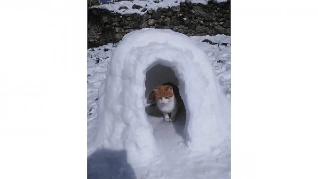 Denizli'de soğuk ve karlı hava etkisini sürdürürken, küçük kızının istediğini kırmayan bir baba, sokakta yaşayan kedilerin üşümemesi için kardan ev yaptı.