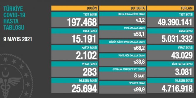 Buna göre, son 24 saatte 197 bin 468 Kovid-19 testi yapıldı, 15 bin 191 kişinin testi pozitif çıktı, 283 kişi hayatını kaybetti.