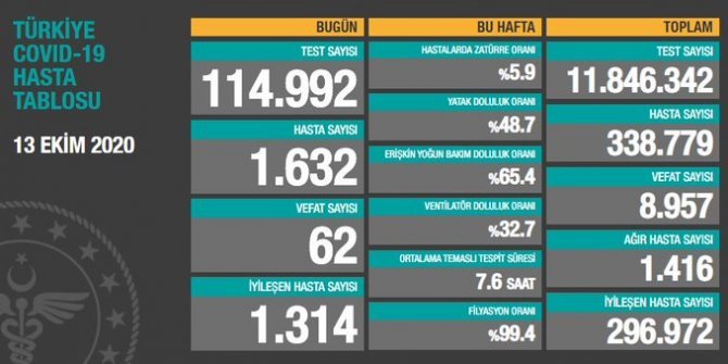 Türkiye'de son 24 saatte 114 bin 992 Covid-19 testi yapıldı, 1632 kişiye hastalık tanısı konuldu, 62 kişi hayatını kaybetti.