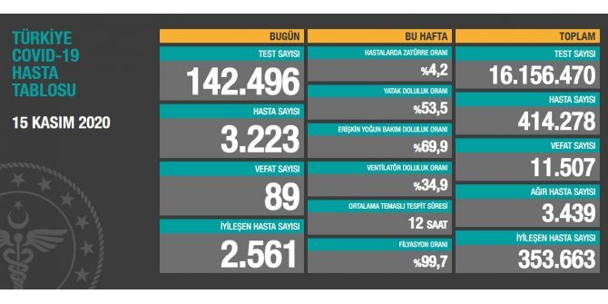 Türkiye'de son 24 saatte 3 bin 223 yeni hasta tespit edildi, 89 kişi vefat etti. 2 bin 561 kişinin daha iyileşmesiyle COVID-19'u yenenlerin sayısı 353 bin 663'e yükseldi.