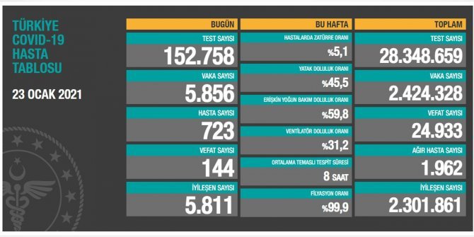 Türkiye'de son 24 saatte 152 bin 758 Covid-19 testi yapıldı, 5 bin 856 kişinin testi pozitif çıktı, 144 kişi hayatını kaybetti.