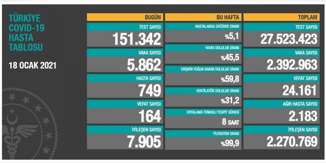 Buna göre, son 24 saatte 151 bin 342 Covid-19 testi yapıldı, 5 bin 862 kişinin Kovid-19 testi pozitif çıktı, 164 kişi hayatını kaybetti. Hasta sayısı 749 olarak açıklandı.