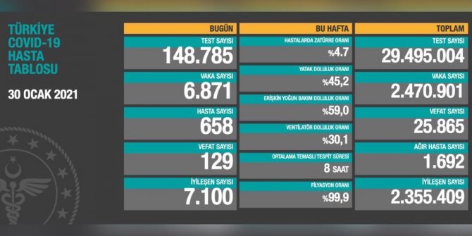 Türkiye'de son 24 saatte 148 bin 785 COVID-19 testi yapıldı, 6 bin 871 kişinin testi pozitif çıktı, 129 kişi hayatını kaybetti.
