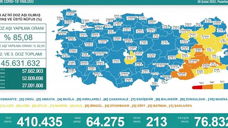 Sağlık Bakanlığı, son 24 saatlik korona virüs tablosunu açıkladı. Türkiye'de son 24 saatte 64.275 kişinin testi pozitif çıktı, 213 kişi hayatını kaybetti.
