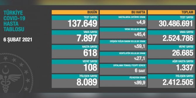 Türkiye'de son 24 saatte 7 bin 897 yeni vaka tespit edildi, 618 hasta belirlendi. 108 kişi vefat etti. 8 bin 89 kişinin daha COVID-19-u yenmesiyle iyileşenlerin sayısı 2 milyon 412 bin 505'e yükseldi.