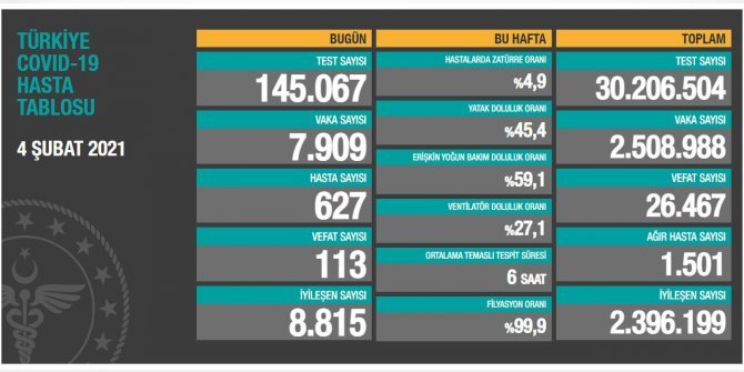 Sağlık Bakanlığı tarafından 2 Şubat koronavirüs tablosu, vaka, hasta, test, vefat sayısı ve son durum açıklandı. Türkiye'de son 24 saatte 145 bin 67 Kovid-19 testi yapıldı, 7 bin 909 kişinin testi pozitif çıktı, 113 kişi hayatını kaybetti. Ağır hasta 1501 oldu, 8 bin 815 kişinin Kovid-19 tedavisinin/karantinasının sona ermesiyle iyileşen sayısı 2 milyon 396 bin 199'a yükseldi.