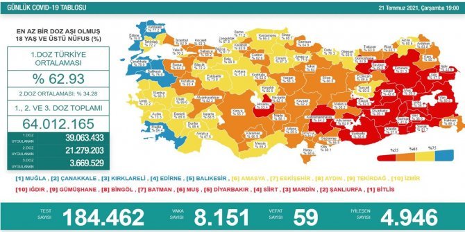 Sağlık Bakanlığı, Günlük Kovid-19 Tablosunu güncelledi. Buna göre son 24 saatte ülkemizde 184 bin 462 Kovid-19 testi yapıldı, 8 bin 151 kişi koronavirüse yakalandı. Vefat sayısı ise 59.