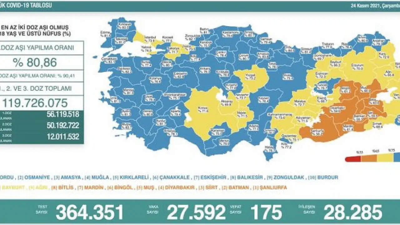 Buna göre, Türkiye'de son 24 saatte 364 bin 351 COVID-19 testi yapıldı, 27 bin 592 kişinin testi pozitif çıktı.