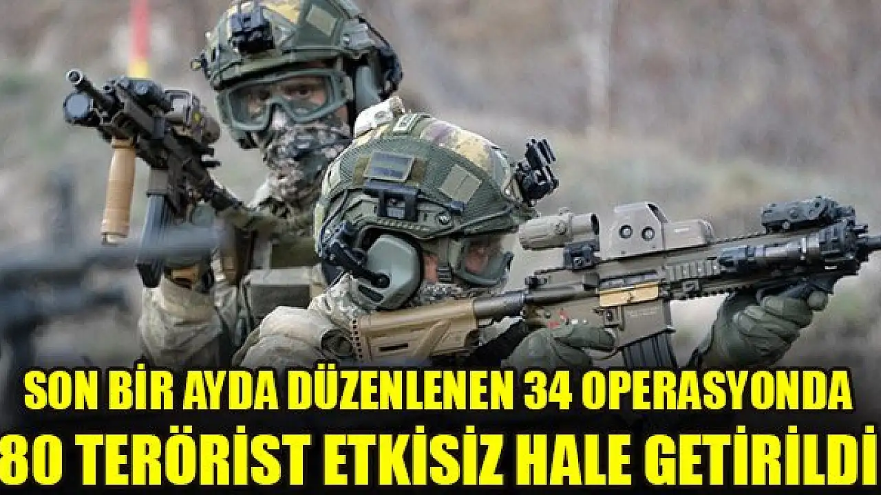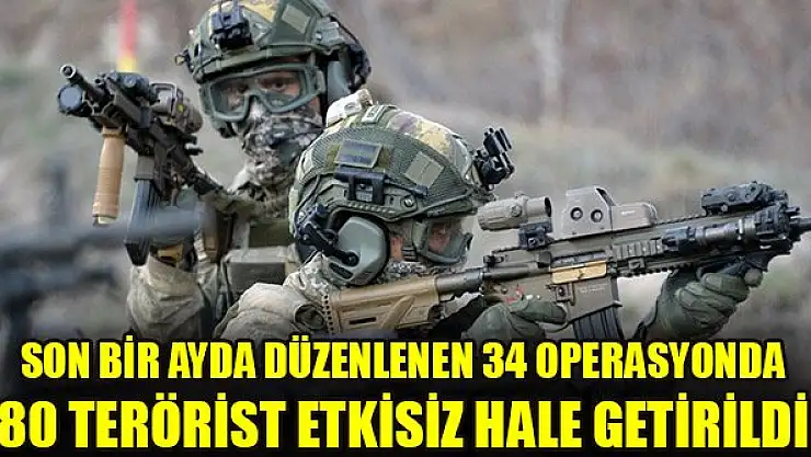 Milli Savunma Bakanlığından yapılan açıklamada, terörle mücadele kapsamında son bir ayda 8'i büyük, 26'sı orta çaplı 34 operasyonda 80 teröristin etkisiz hale getirildiği bildirildi.