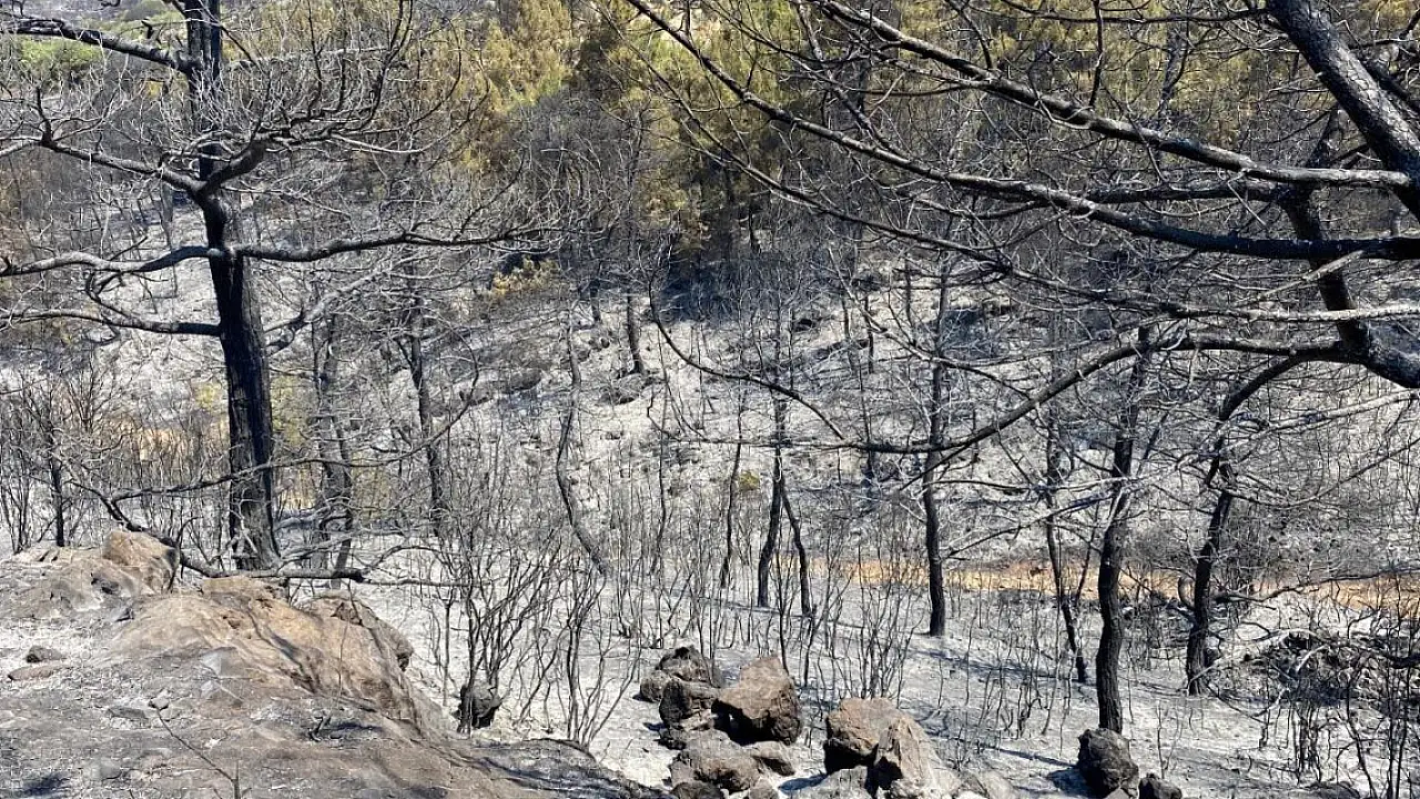 Yangında zarar gören ormanlık alanlar, gri ve siyah renge büründü. Dron ile çekilen görüntülerde, yanan ve zarar gören ormanlık alanlar yer aldı.