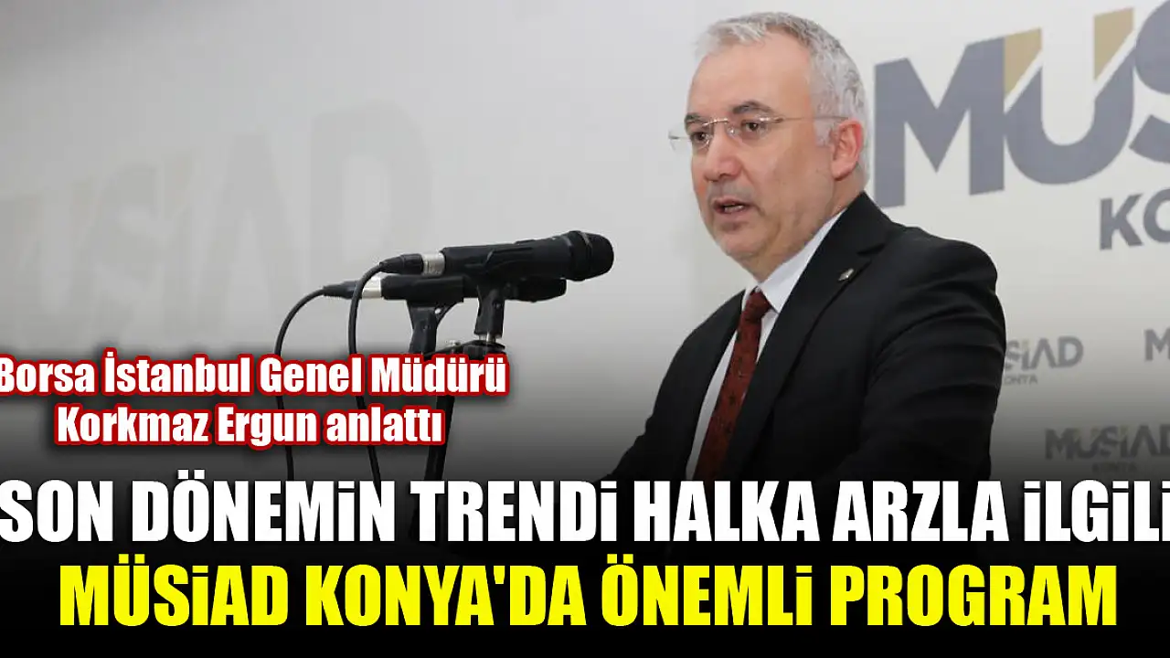 MÜSİAD Konya Şubesi'nde düzenlenen 'Yatırımların Finansmanında Halka Arz' programına Borsa İstanbul Genel Müdürü Korkmaz Ergun konuşmacı olarak katıldı. Ergun, 'Borsalar temel olarak bilgi teknoloji şirketidir. Yani alıcı ile satıcının buluştuğu bir platformdur. Alıcı ve satıcı gelir. Satıcıdan malı, alıcıdan parayı alırsınız takas gerçekleşir.' dedi.