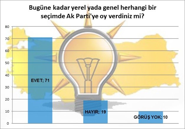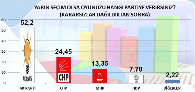 "Yarın seçim olsa oyunuzu hangi partiye verirsiniz?" sorusuna verilen yanıtlar; kararsızların matematiksel dağılımının sonunda AK Parti 52,66, CHP 24,45, MHP 13,35, HDP 7,78, diğerleri başlığı altıda diğer parti ve bağımsız adayların ise 2,22 de kaldığını göstermektedir. HDP % 10 luk baraja net olarak takılmış görülmektedir.