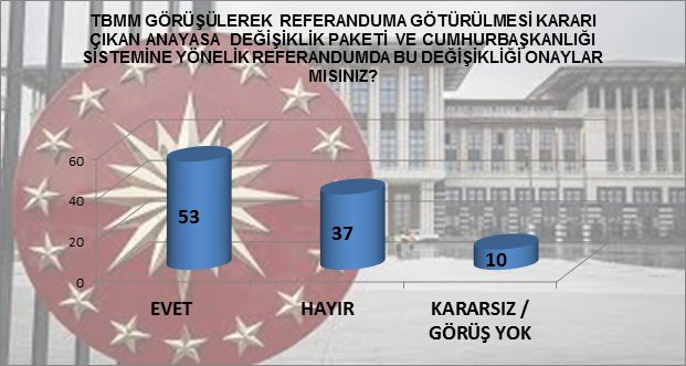 Sorusuna seçmenlerin % 53'ü EVET derken, % 37 HAYIR demektedir. İlgili Anayasa değişikliği TBMM de görüşülürken kararsız oranı % 20 lerde iken şu an bu oran % 10 lara inmiş görülmektedir.