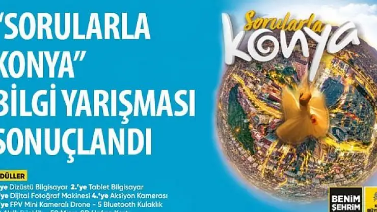 Konya Büyükşehir Belediyesi'nin gençlerin Konya'yı daha iyi tanıması ve yarıyıl tatilini verimli geçirmesi amacıyla gerçekleştirdiği 'Sorularla Konya' bilgi yarışmasının kazananları belli oldu. 12-15 yaş aralığında öğrencilerin katıldığı yarışmada dereceye girenlere çeşitli hediyeler verildi.