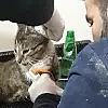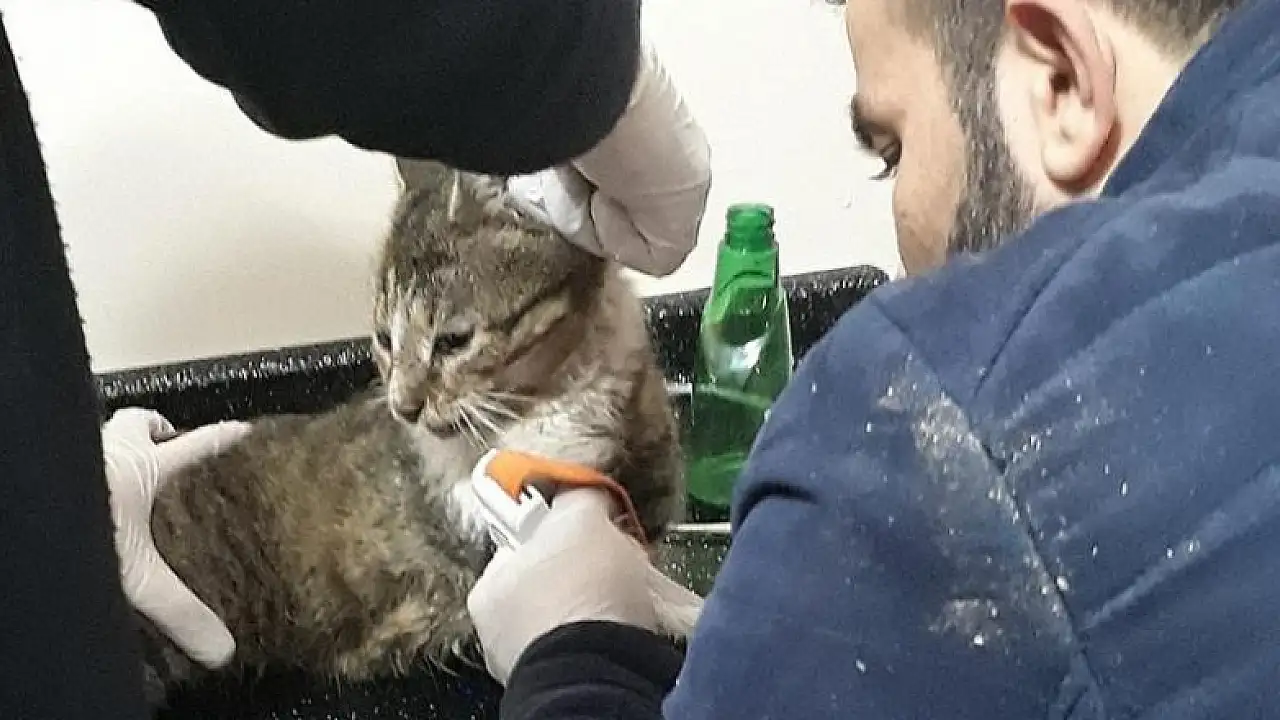 Bitkin durumdaki kediyi hemen Turgutlu'da bir veterinere götüren kasap İkram Korkmazer, buradaki müdahalenin ardından "Yeşim"i Manisa kent merkezindeki bir veteriner kliniğine getirdi.