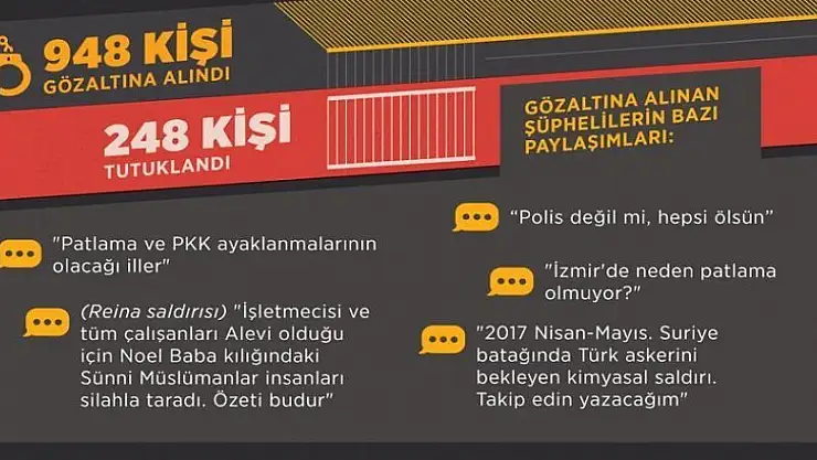 İstanbul'un Beşiktaş ilçesinde gerçekleştirilen terör saldırının ardından sosyal medyada terör yanlısı paylaşımlarda bulunduğu ya da örgüt propagandası yaptıkları iddiasıyla 948 kişi gözaltına alındı, zanlılardan 248'i tutuklandı.