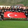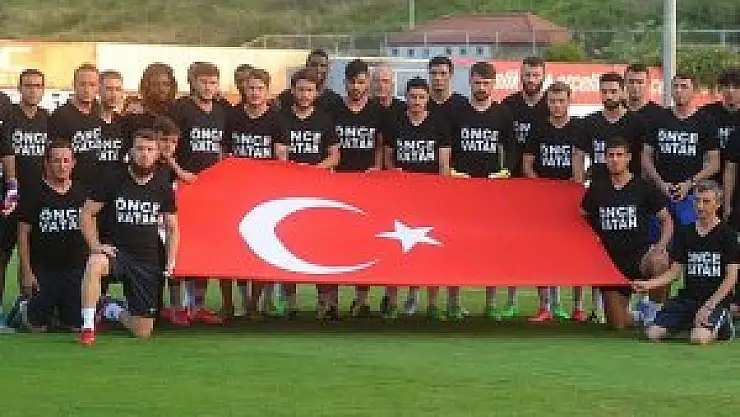 Tribünlerde de "Şehitler ölmez vatan bölünmez" sloganları atılırken, dev Türk bayrağı açıldı.