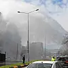 Ağır hasar gören apartman çökme riskine karşı polis ekiplerince güvenlik şeridine alınırken, karayolu adeta savaş alanına döndü.