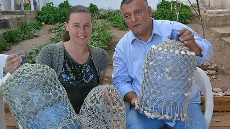 Balıkesir'in Ayvalık ilçesinde yaşayan Alman tıp doktoru, midye, deniz salyangozu ve istiridye gibi yumuşakçaların deniz kıyısına vuran kabuklarındansu damacanalarına kılıf yapıyor.
