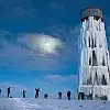 Van'da aşırı soğuk nedeniyle boruları patlayan 20 metre yüksekliğindeki su deposu, akan suların donmasıyla "buz kulesi"ne dönüştü.