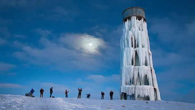Yaklaşık 20 metre yüksekliğinde 4 katlı su deposunda patlayan borulardan akan suların donması, ortaya "buz kulesi"ni andıran görüntüler çıkardı.