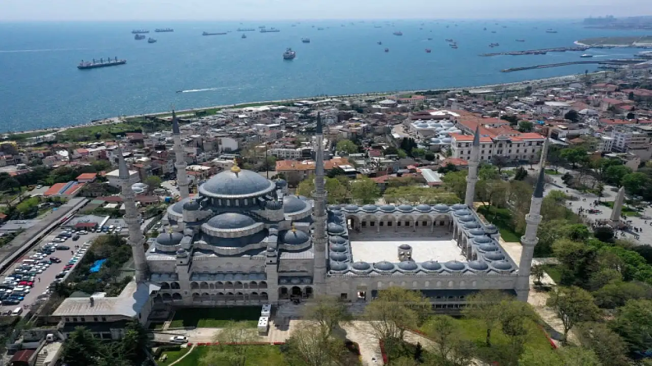 Sultanahmet Camii, Cumhurbaşkanı Recep Tayyip Erdoğan'ın katılımıyla bugün cuma namazının ardından ibadete açılacak. Restorasyonu 2018'den beri devam eden cami dronla görüntülendi.