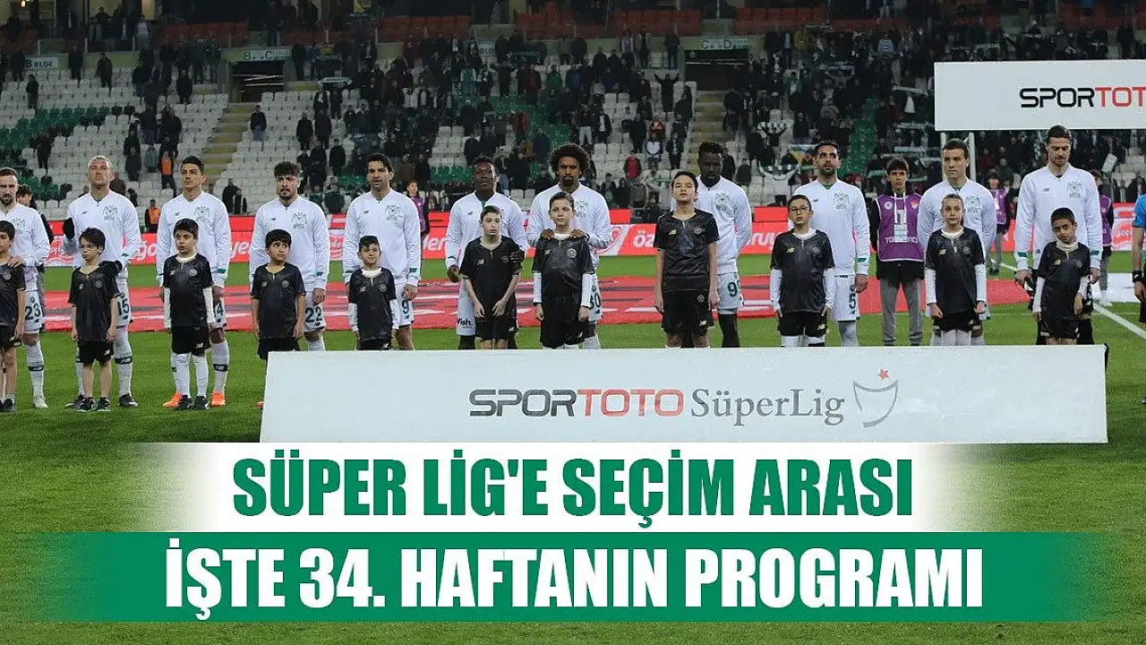 Süper Lig'e 14 Mayıs seçim arası girecek. Spor Toto Süper Lig'de 34. hafta müsabakaları cumartesi-pazar günü oynanmayacak. TFF'nin açıkladığı fikstüre göre yeni haftanın perdesi salı günü Sivas'ta, Sivasspor- Kasımpaşa maçıyla açılacak. Arabamcom Konyaspor, Corendon Alanyaspor deplasmanına aynı gün saat 20:00'de çıkacak. Süper Lig'de yeni maç programı şu şekilde hazırlandı;