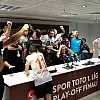 Basın toplantısının sona ermesiyle toplantı odasına aniden giren Pendiksporlu futbolcular, Osman Özköylü'yü ıslatarak, Süper Lig'e çıkmanın coşkusunu burada da devam ettirdi.