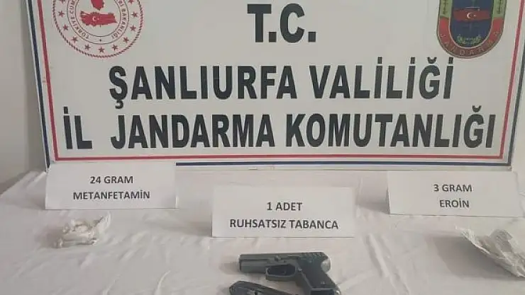 Edinilen bilgiye göre, Suruç İlçe Jandarma Komutanlığı ekipleri, Günenakan kırsal Mahallesi Tezuken mevkisinde devriye görevi sırasında şüphelendikleri bir aracı durdurdu. İçerisinde 2 kişinin bulunduğu araçta arama yapan ekipler, 3 gram eroin, 24 gram metamfetamin ve 1 adet ruhsatsız tabanca ele geçirdi.