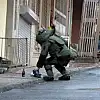 Özel giysi giyen bomba imha uzmanı, şüpheli paketi fünye patlatarak etkisiz hale getirdi.