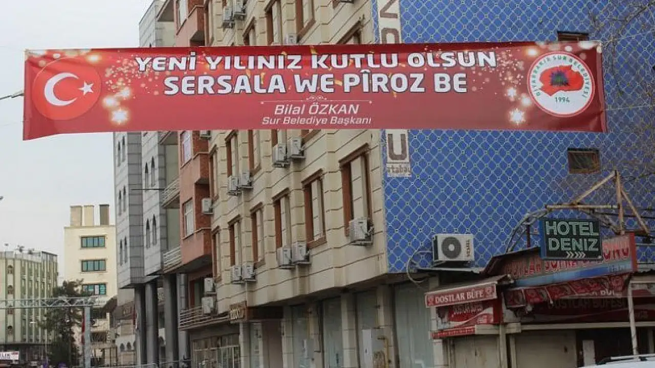 İçişleri Bakanlığınca görevlendirme yapılan Diyarbakır'ın Sur Belediyesi, vatandaşların yeni yılını Türkçe ve Kürtçe afişler ile kutladı.