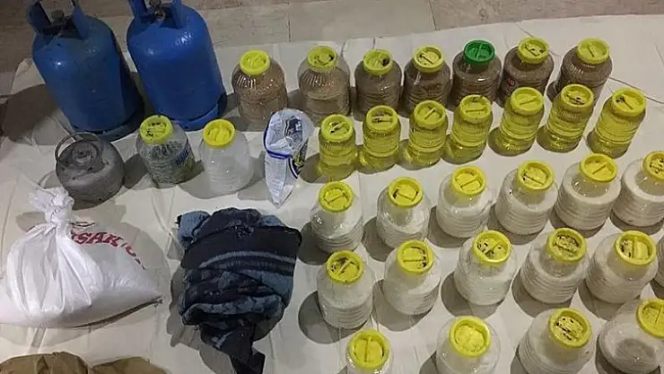 Evdeki aramalarda 2 büyük mutfak tüpü, piknik tüpü, 5 litrelik plastik bidonda patlayıcı olduğu değerlendirilen toz madde, yarım çuval amonyum nitrat olduğu değerlendirilen gübre, 5 litrelik plastik bidonda çok sayıda cam bilye, 3 litrelik bidonlarda benzin olduğu değerlendirilen 7 sıvı madde ile içlerinde toz şeker ve buğdayın da olduğu, ayrıştırma işlemi yapıldığında ise yoğun benzin kokusu gelen çeşitli ebatlarda 18 bidon malzeme ele geçirildi.