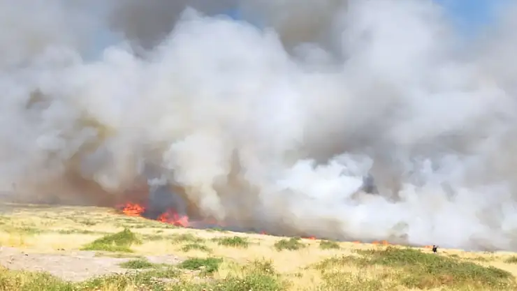 Mardin'in Nusaybin ilçesinde, Suriye sınırında mayınlı bölgede çıkan ot yangını, ekiplerin müdahalesiyle kontrol altına alınarak söndürüldü.