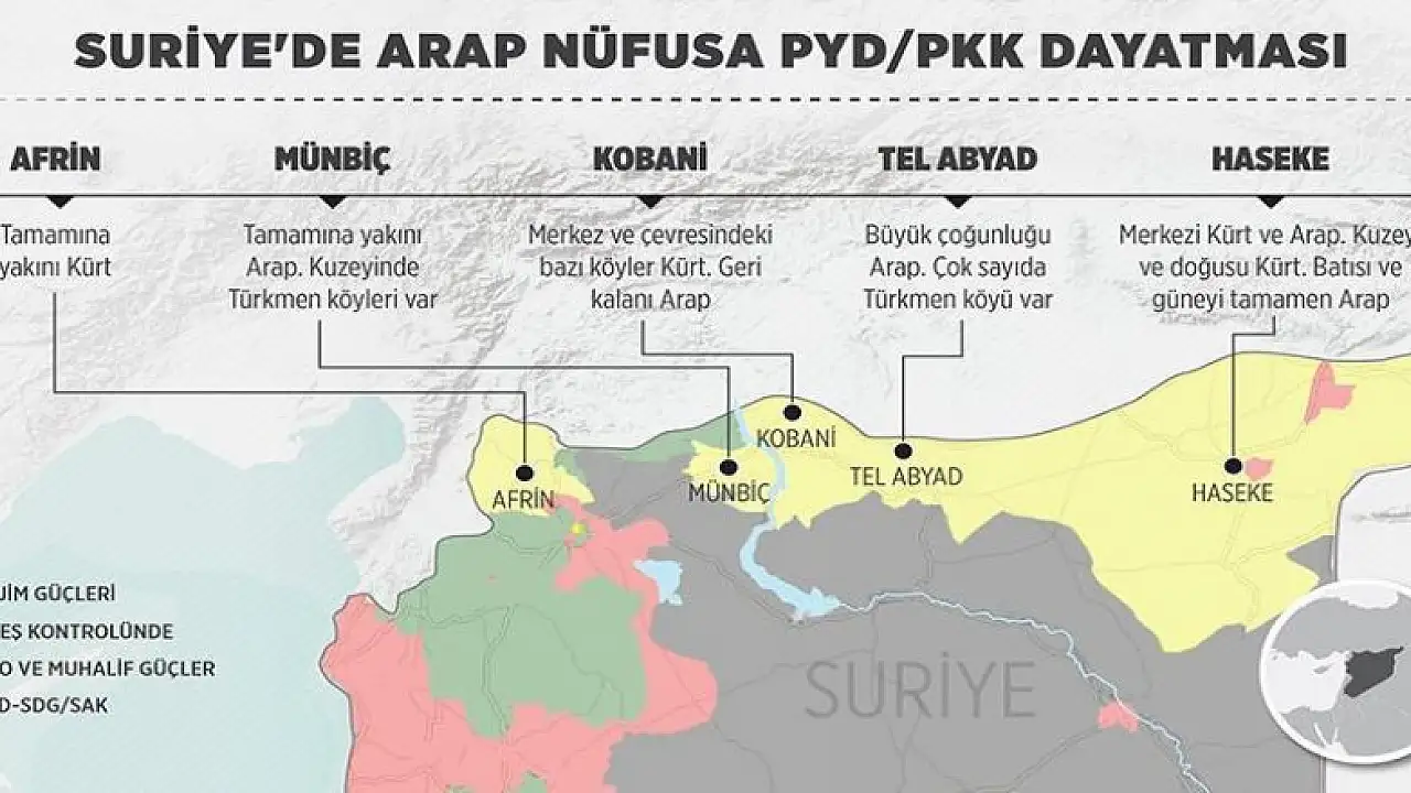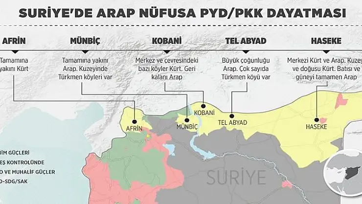Suriye'nin kuzeyinde PYD/PKK'nın hakim olduğu 5 temel bölgeden yalnızca Afrin'deki nüfusun tamamına yakını Kürtlerden oluşuyor. Örgüt, büyük bir Arap nüfusa ise silah zoruyla kendi hakimiyetini dayatıyor.