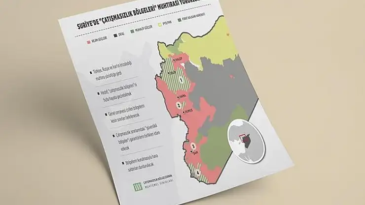 Kazakistan'ın başkenti Astana'da Türkiye, Rusya ve İran arasında imzalanan muhtıra kapsamında, Suriye'de muhalifler ve rejim güçleri arasında çatışmaların en yoğun olduğu alanlarda 4 "çatışmasızlık bölgesi" ve bu bölgelerin sınırları boyunca "güvenlikli bölgeler" kurulacak.