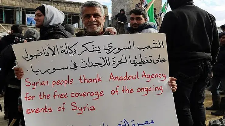 Gösteri sırasında bir sivilin taşıdığı "Suriye halkı, Suriye'deki olayları tarafsız şekilde aktaran Anadolu Ajansına teşekkür eder" yazılı pankart dikkati çekti.