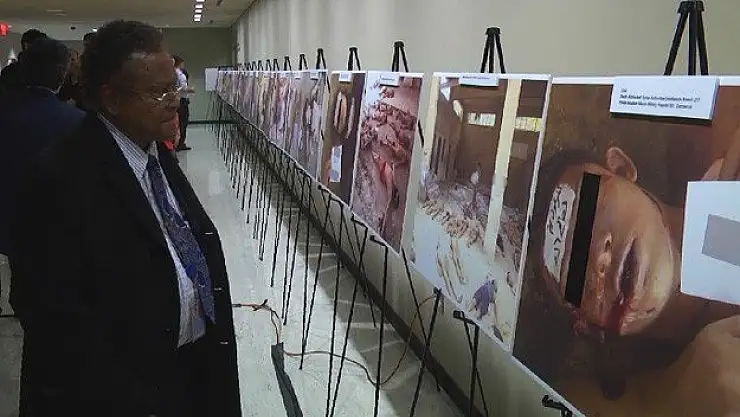 Dünya kamuoyuna AA tarafından duyurulan ve Suriye'de Esed rejimi tarafından işlenen savaş suçlarını belgeleyen fotoğraflar BM Genel Merkezi'nde açılan sergide izlenime sunuldu.