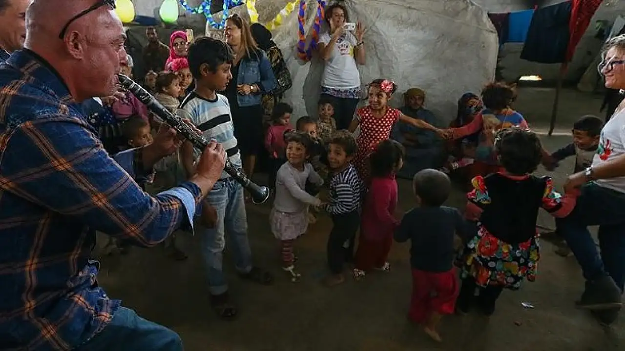Balon ve kağıt süslerle donatılan alanda, Azeri asıllı İranlı Ramin Farhangniya'nın yönettiği koroyu dinleyen Suriyeli çocuklar, şarkılara alkışlayarak ve dans ederek eşlik etti.