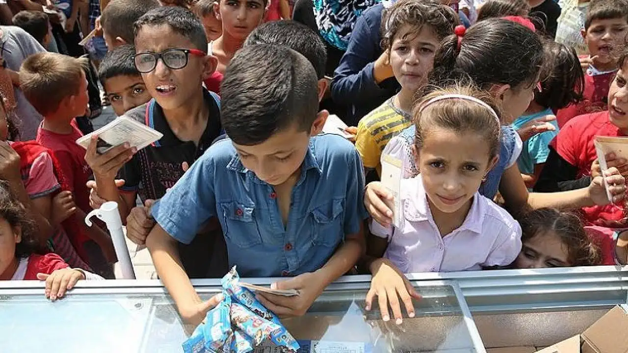 Yaklaşık 8 bin kişinin kaldığı kampın meydanına getirilen toplam 15 bin dondurmayı almak için onlarca çocuk sıraya geçti.