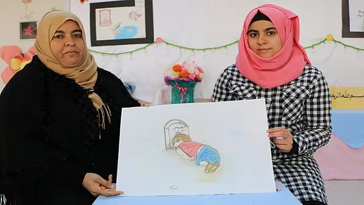 Şanlıurfa'nın Harran ilçesinde konteyner kentte kalan 17 yaşındaki Suriyeli kız, Arap dünyasının dikkatini ülkesinde yaşananlara çekmek için Aylan bebeğin resmini yaptı.