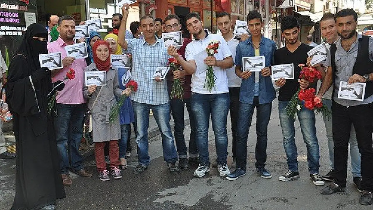 Ülkelerindeki iç savaştan kaçarak, Türkiye'ye sığınan Suriyeli gençler, gördükleri misafirperverliğe teşekkür için Kilis'te karanfil ve broşür dağıttı.