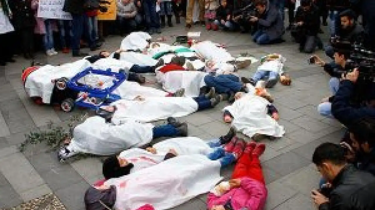 Balıklı Parkı'nda ellerinde dövizlerle bir araya gelen Suriyeliler, Arapça marşlar söyledi. Ardından Suriyeli çocuk ve kadınlardan oluşan bir grup, tiyatro gösterisiyle bombardımanda ölen kadın ve çocukların yaşadığı dramı anlattı.