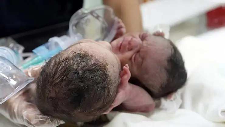Suriye'nin İdlib kentinde yaşayan Fuat Yaseri (30) ve Rağde El-Delli (30) çiftinin ikiz kız bebekleri, 2 kilo 70 gram ağırlığında sezaryenle bedenlerinden yapışık halde dünyaya geldi.
