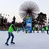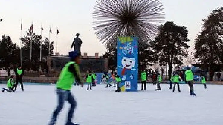 Erzurum'da etkili olan soğuk havanın ardından donan bin 800 metrekarelik süs havuzunda, aynı anda 80 kişiye ücretsiz buz pateni eğitimi veriliyor.