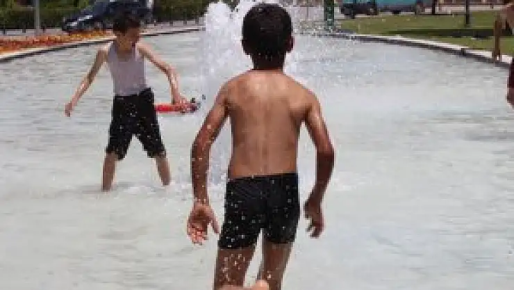 Konya'da sıcak havadan bunalan çocuklar, elektrik çarpma tehlikesini aldırış etmeden süs havuzuna girerek serinlemeye çalıştı.