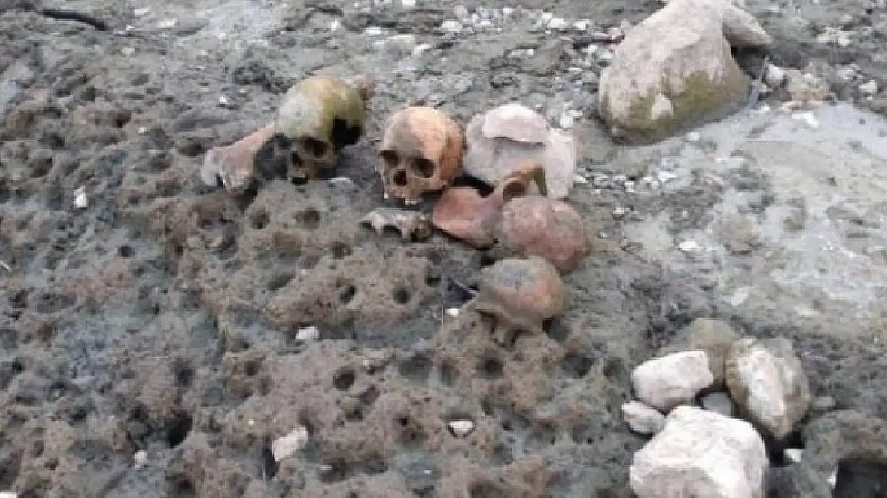 Suyu boşaltılan göletten kafatasları ve kemikler çıktı