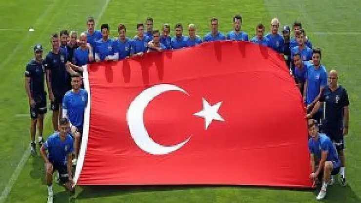 Sarı-lacivertli futbolcular ile teknik heyetin, sahada Türk bayrağıyla poz verdikleri aktarıldı.