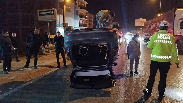 Bursa'nın Orhangazi ilçesinde kaldırıma çarpan otomobil takla atarak ters döndü.