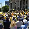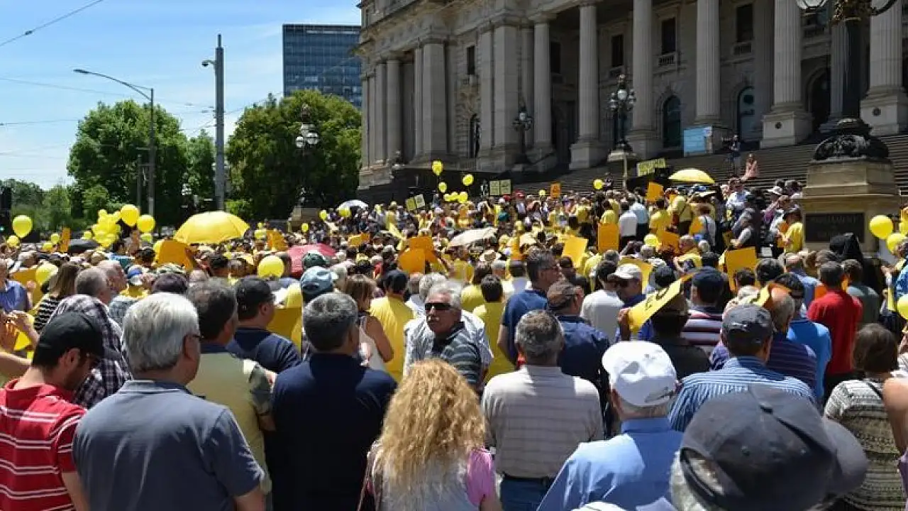 Melbourne'daki Victoria Eyalet Parlamentosu önünde toplanan plaka sahipleri ve taksi sektöründe çalışan yüzlerce kişi eyalet hükümetinin uygulamalarını protesto etti.